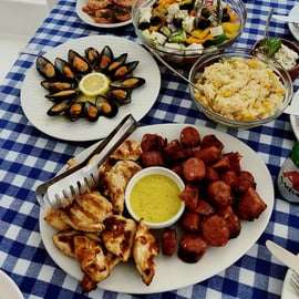 Votre prochain arrêt se fera dans la baie de Vouliagmeni, près de la plage d'Astir, un endroit idéal pour vous asseoir, vous détendre et savourer un barbecue fraîchement préparé à bord. Le menu comprend du poulet, des saucisses, des fruits de mer, des trempettes et des salades grecques, ainsi qu'un dessert rafraîchissant.