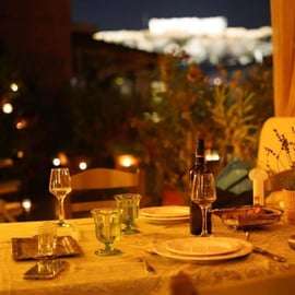 Offrez-vous un dîner de 7 plats et du vin sur un toit offrant une vue imprenable lors de cette expérience gastronomique à Athènes. Dégustez des plats grecs authentiques tout en profitant d'une vue dégagée sur l'Acropole.