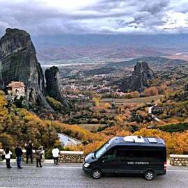 Jour 1 : Prenez le bus pour Kalambaka depuis la gare d'Athènes Larissa dans la matinée et profitez d'un voyage qui vous donnera l'occasion d'admirer la beauté de la campagne grecque. À votre arrivée à Kalambaka dans l'après-midi, un minibus VIP viendra vous chercher à votre hôtel pour vous emmener à la visite des Météores au coucher du soleil, afin d'admirer des vues à couper le souffle sur les Météores et de découvrir les joyaux cachés de ce lieu.