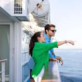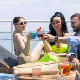 Alors que nous rentrons vers Athènes en fin d'après-midi, l'heure dorée jette une lueur chaude sur la mer et le littoral. L'ambiance à bord devient plus animée, avec une musique douce et les passagers profitant des derniers moments de la journée. Détendez-vous sur le pont en plein air, relaxez-vous sur un pouf confortable et admirez la vue imprenable sur le coucher de soleil derrière la Riviera athénienne. C'est le moment idéal pour prendre des photos avec le ciel coloré en toile de fond, savourer une boisson rafraîchissante et regarder les lumières de la ville apparaître progressivement à l'horizon.